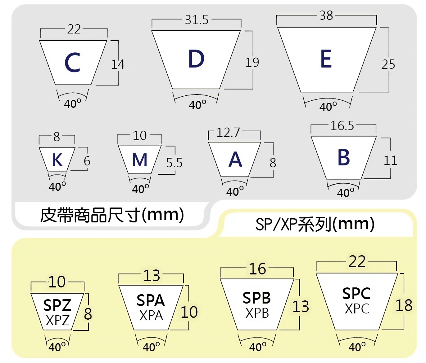 三角皮帶,是所有傳動皮帶種類中使用範圍最廣、型式最多的,特別是工業驅動和交通工具應用方面。三角皮帶之剖面成梯形,可以緊緊地楔入槽輪(Sheave)增加摩擦力,藉由摩擦力來傳動,並且允許在滑動情況發生前可傳動較大的力矩。利用三角皮帶可增大摩擦力,不需如平皮帶般要藉由較大的張力才能維持傳動所需的摩擦力,故可減輕槽輪軸承的負載,除此之外,對正性較不要求,規格有A、B、C、D等以及SP系列。